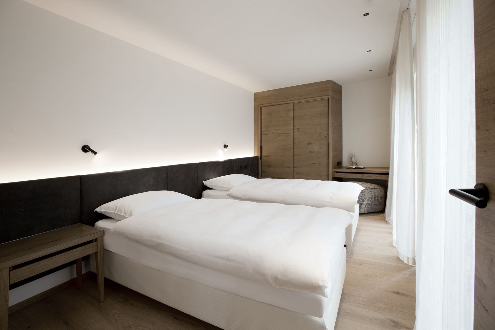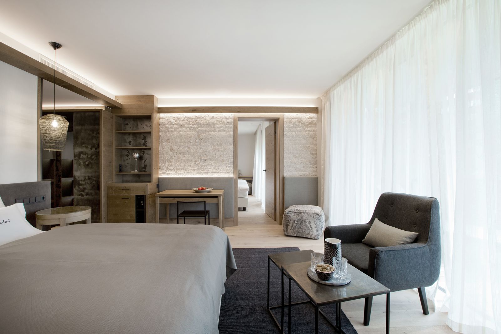 Stammhaus Familien-Suite, moderne Ausstattung, 1. Schlafzimmer ca. 35 m², Holzboden, Schreibtisch, Sitzecke, Minibar, TV-Radio, Badezimmer mit Dusche, Doppel-Waschtisch, WC separat mit Bidet, King Size Doppelbett, großzügiger Balkon. Kinderzimmer mit ca. 15 m², 2 Betten und TV-Radio.