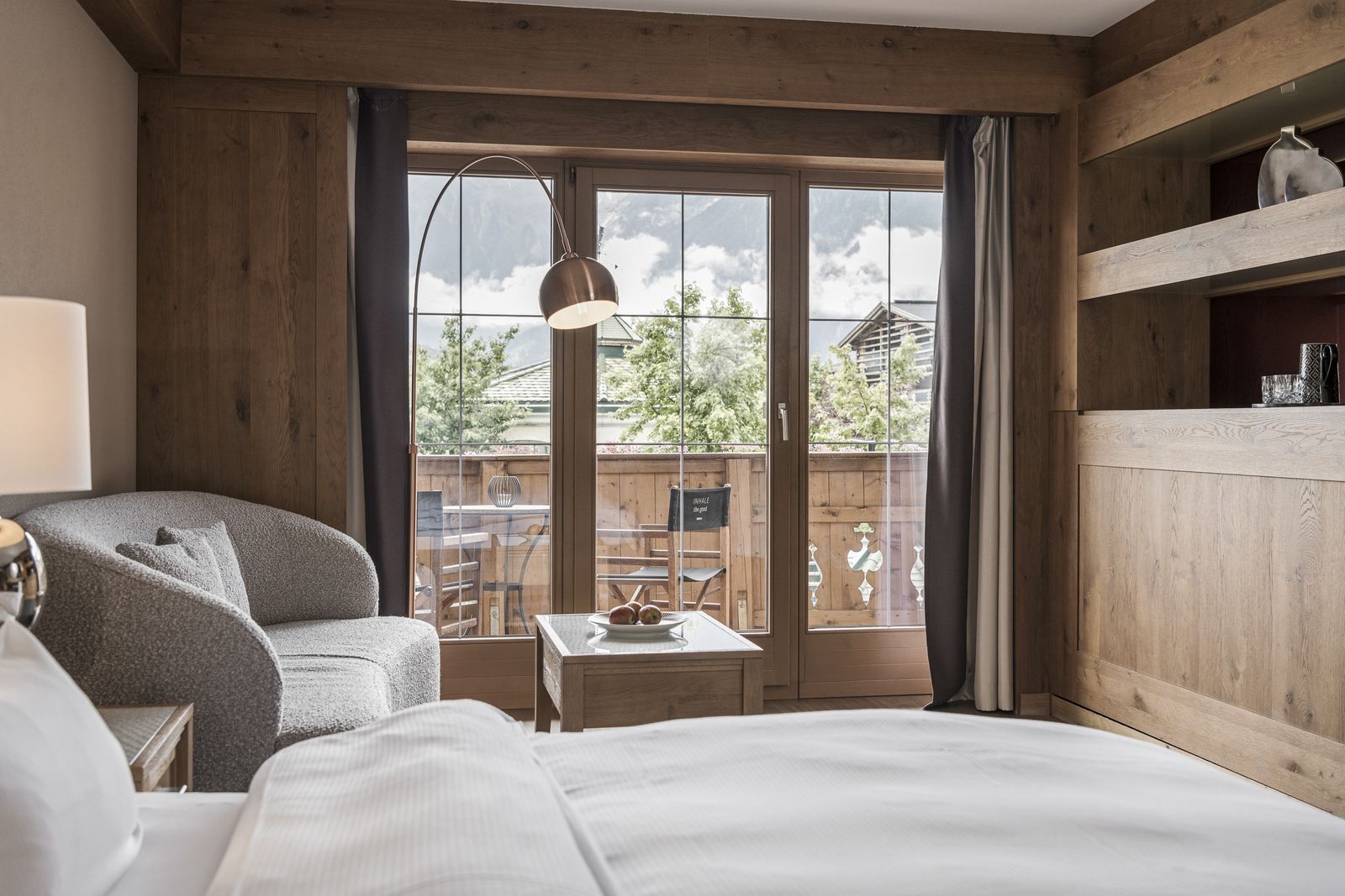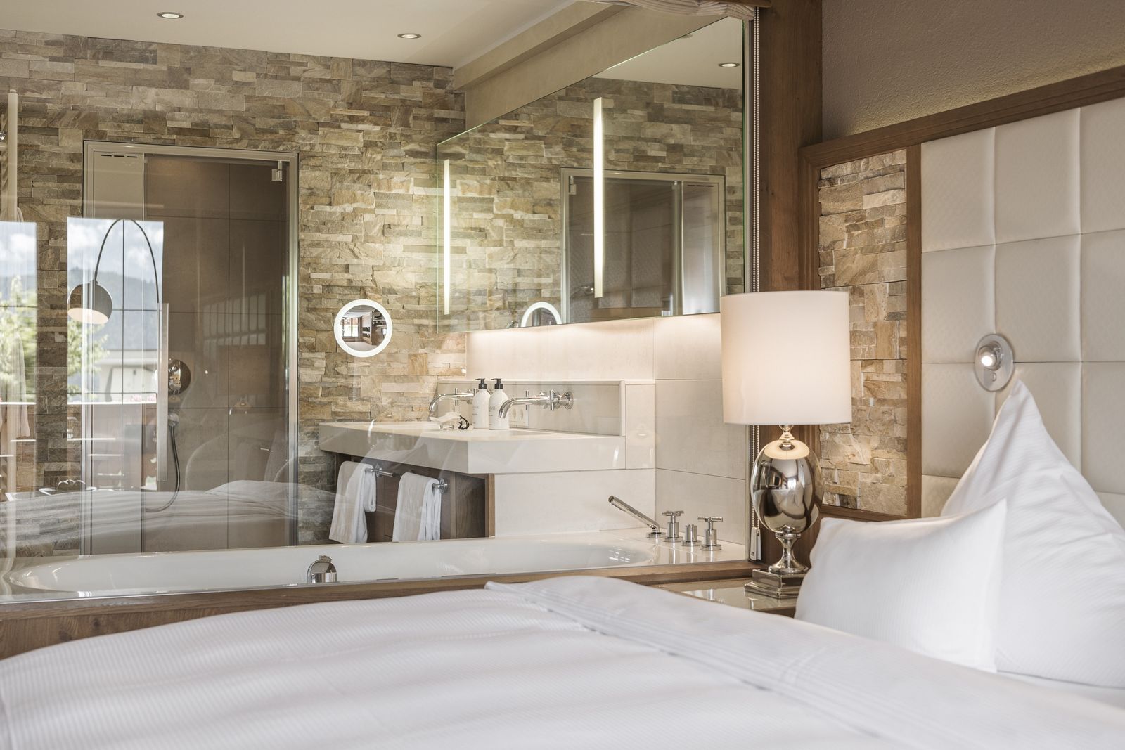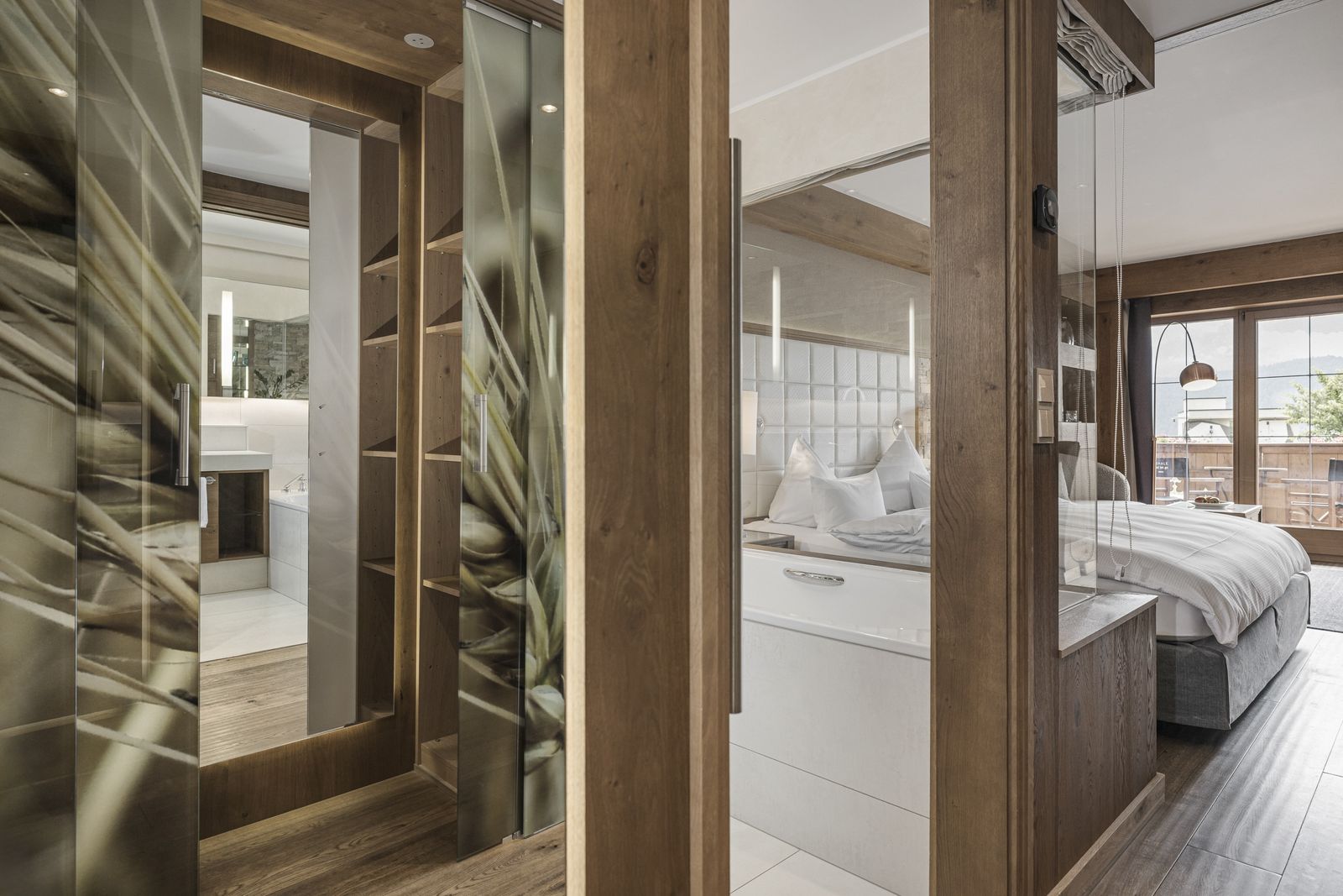 Modernes elegantes Zimmer, hochwertiger Holzboden, Klimaanlage, Balkon. Sitzecke mit Couch. Großes helles Badezimmer mit Badewanne und Dampfdusche, durch Glas und Vorhang zum Wohnraum hin getrennt, WC separat.