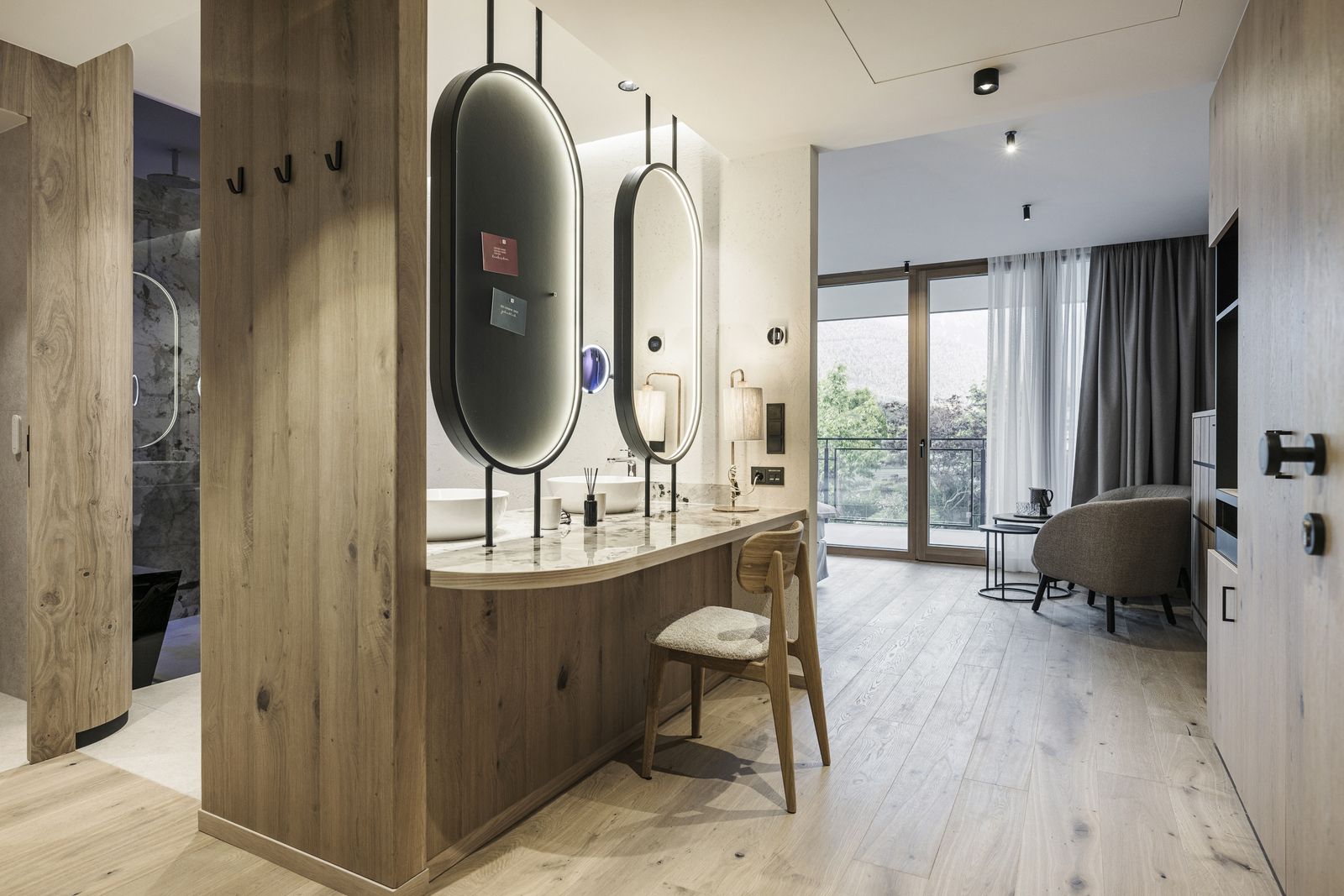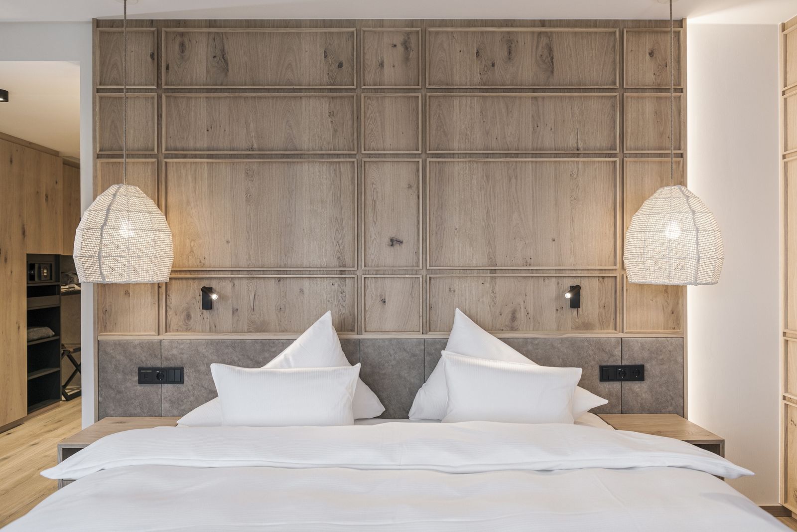 modern ausgestattetes, helles Doppelzimmer, ca. 39m². Holzboden, Klimaanlage, Minibar, TV, Badezimmer mit Dusche, Doppel-Waschtisch, WC separat, King Size Doppelbett, Balkon. Infrarot Saunakabine.